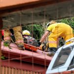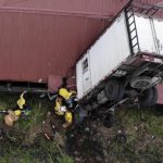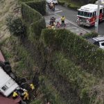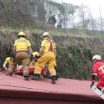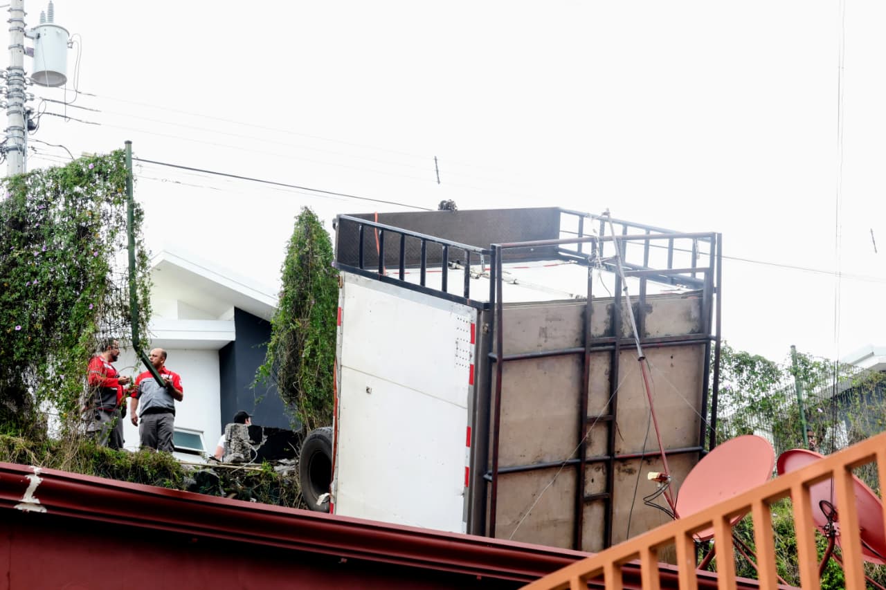 equipo Bomberos de Costa Rica y el Cruz Roja Costarricense Continúan trabajando en el lugar del accidente ocurrido en San Miguel de Santo Domingo, Herediadonde un camión iba a exceso de velocidad y caído en el techo de una casa.