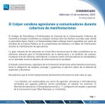 El Colegio de Periodistas y Profesionales en Ciencias de la Comunicación Colectiva de Costa Rica (Colper) expresó su fuerte rechazo en respuesta a las agresiones sufridas por el periodista karen dondi y el fotoperiodista marco mongequienes fueron agredidos por agentes de la Fuerza Pública mientras realizaban cobertura periodística durante la protesta campesina.