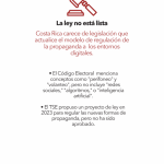 En Costa Rica No tenemos legislación Funciona nuestro modelo de regulación de propaganda en entornos digitales. El código electoral está diseñado para un ecosistema de medios del siglo XX, con la mención de palabras como redes periféricas pero sociales, algoritmos o inteligencia artificial.