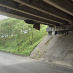 Placas de metal sueltas y colgantes debajo de una estructura de puente en la ruta 32 conductores agrícolas que viajan por el área.