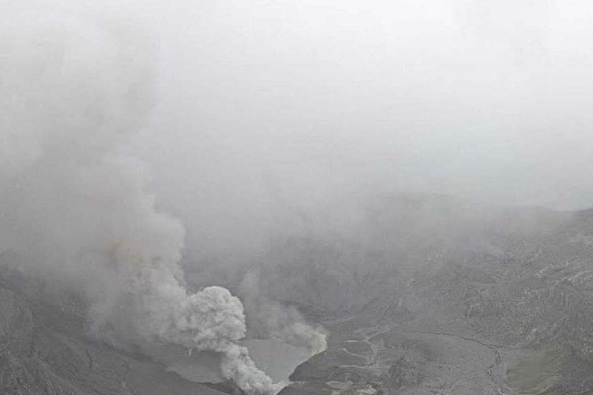 La pluma rica en vapor de agua y los gases magmáticos tienen gris debido a los impuestos de AS. El viento se extiende por las cenizas al oeste. Hasta ahora no hay informe de cada eje.